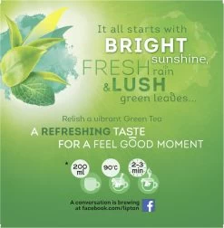 Lipton Intense Mint Groene Thee is een heerlijke groene thee gemaakt met echte muntblaadjes. Met de smaak van groene thee en mint voel je je in een mum van tijd helemaal verfrist. Perfect om de dag mee te beginnen, maar ook lekker om te drinken na je work-out of tijdens een momentje voor jezelf. De veelzijdige Lipton-smaken zijn gecombineerd in een piramidevormig zakje dat speciaal is ontwikkeld om de ingrediënten meer ruimte te geven om te trekken. Op die manier komen de theeblaadjes, echte stukjes fruit en kruiden het best tot hun recht. Laat de thee daarom 2 tot 3 minuten trekken en pak even jouw theemoment. Bij Lipton geloven we dat kleine veranderingen een groot verschil kunnen maken voor de planeet. Na de overgang van Lipton Ice Tea naar volledig gerecycled plastic in 2020 worden de theezakjes van Lipton in 2021 volledig biologisch afbreekbaar. Dit betekent dat de theezakjes bij het gft-afval kunnen worden weggegooid. In de loop van het jaar zal Lipton de doosjes met plastic verpakking vervangen door kartonnen doosjes met een beschermende coating. Deze kartonnen verpakkingen kunnen worden gerecycled bij het oud papier. Hiermee zal Lipton alleen in Nederland al 88 ton plastic per jaar besparen. Elk kopje Lipton-thee wordt duurzaam gekweekt op Rainforest Alliance gecertificeerde theeplantages met behulp van natuurlijke regen, wind en zonneschijn om je onze kenmerkende smaak en het rijke aroma te geven. Zo kan elk kopje van onze thee niet alleen je dag helpen opfleuren, maar ook de toekomst van al onze theeboeren en hun families, en natuurlijk ook onze planeet.