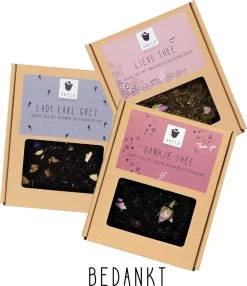 De drie theedoosjes zitten verpakt in een foliezak en wordt geleverd met een cadeaukaartje waar u een korte boodschap op kan schrijven.