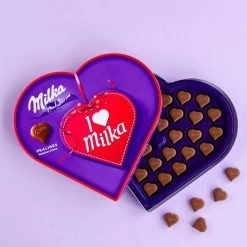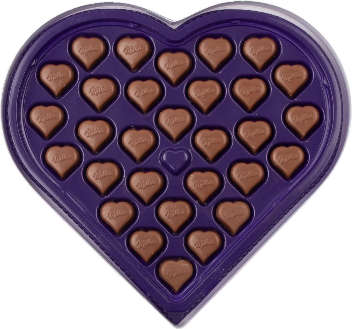30 Milka pralinés hazelnut creme van 100% alpenmelkchocolade in een hartvormige doos van 26 x 25 cm