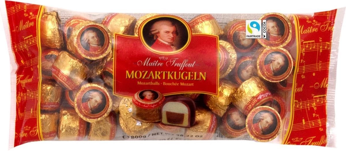 | Verpakkingsinhoud | Mozartkogels 800g De fijne Mozartkogels van Maître Truffout zijn gevuld met pistache-marsepein, marsepein en hazelnoot nougat, overgoten met een laag gesmolten melkchocolade en edele pure chocolade. |
