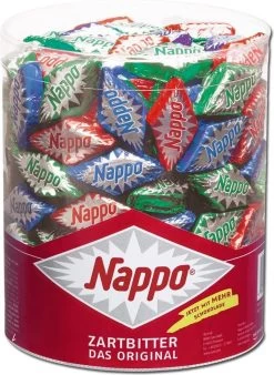 Individueel verpakte diamanten (circa 200 stuks) gemaakt van Nederlandse nougat met een laagje pure chocolade. De klassieker sinds 1925. Donkere chocolade van Nappo is cult. Want de heerlijke diamanten staan al bijna een eeuw voor puur genieten en uitbundig snackplezier. De lekkernijen worden bereid uit de beste Hollandse nougat en bieden heerlijk kauwplezier. Een laagje fijne donkere chocolade vult de specialiteit aan en maakt er uiteindelijk een absoluut smaakhoogtepunt van.