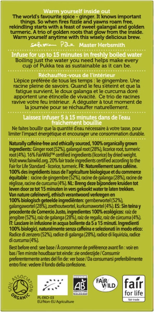 IngrediëntenGemberwortel (51%), galangalwortel (28%), zoethoutwortel, kurkumawortel (4%), gember essentiële olie aroma (1%). 100% gecertificeerd biologisch.