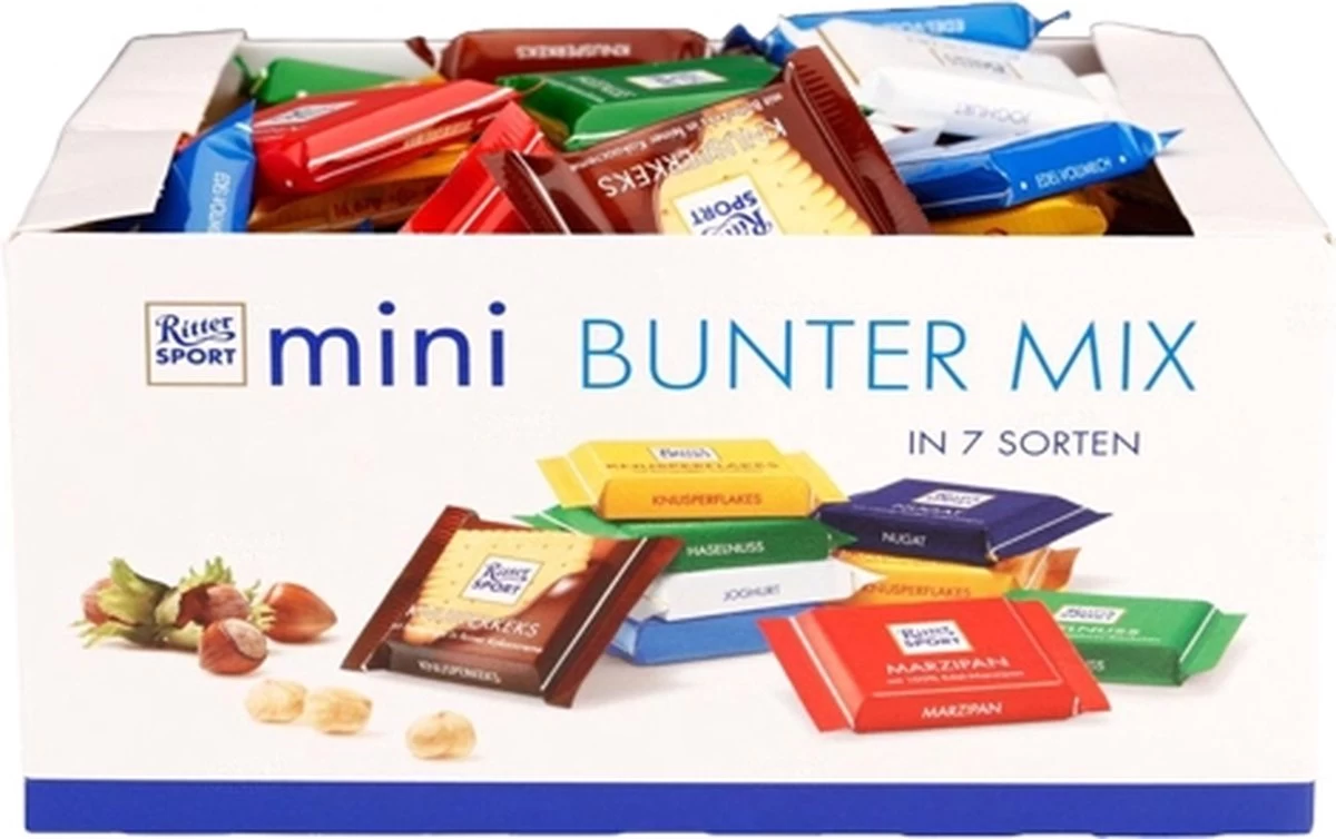 | Verpakkingsinhoud | ca. 84 mini Ritter Sport chocolaatjes (16,6g) |