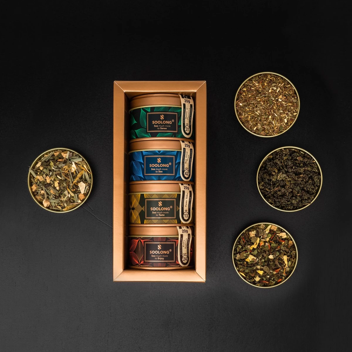 Een werelds geschenk van vier heerlijke losse theeën in prachtige blikken.