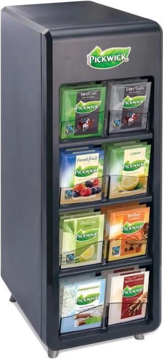 De Pickwick 8-vaks theedispenser is gevuld met 8 verschillende theesmaken en past perfect naast uw koffiemachine.