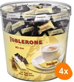 Toblerone horeca mixbox is gevuld met mini uitvoeringen van de bekende Toblerone-chocolade met een bergachtige vorm in een handig bakje. De mix bestaat uit de smaken melkchocolade, witte chocolade en donkere chocolade. De chocolade bevat stukjes noga, amandel en honing.