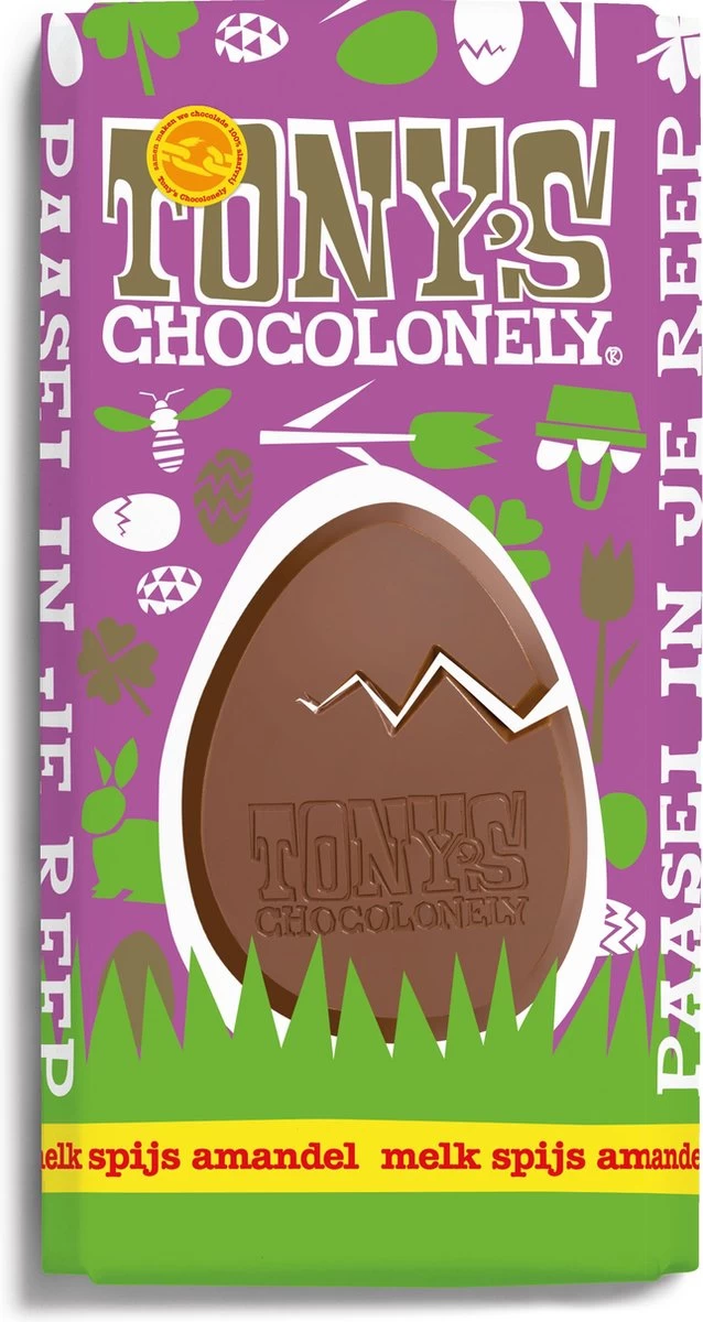 Gevonden.. hij zit gewoon in deze repen! Tony’s paasei in je reep, met paasbeste smaakcombinaties: romige melkchocolade met amandelspijs en nootjes & Melkchocolade met meringue (uiteraard gemaakt van vrije-uitloopeieren) en ’n zuurtje van citroen. Die misstaan niet bij ’t paasontbijt (move over paasstol!). Nog meer bleiheid aan ’t paasontbijt? Die vind je aan de binnenkant van deze wikkel. Gegarandeerd ’n blij ei!