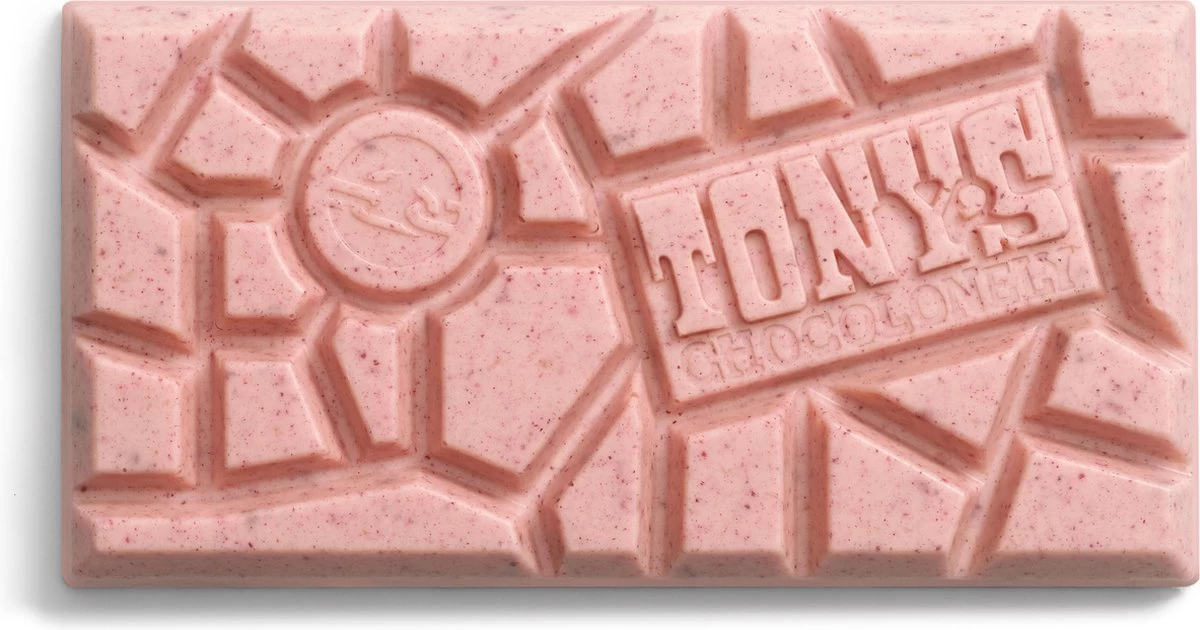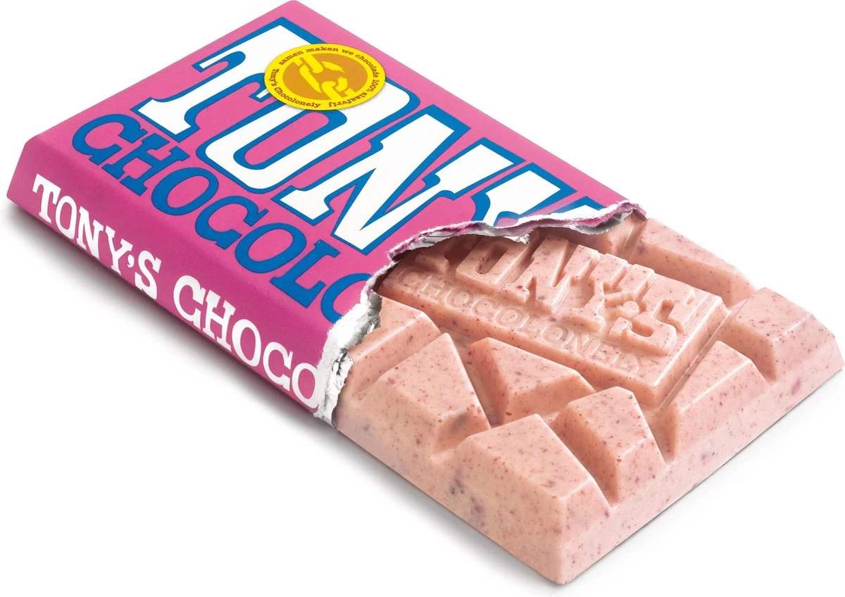Witte chocolade met fruitige stukjes framboos én ’n royale schep knettersuiker. Terug van weggeweest en here to stay! Zijn ze nou helemaal knetter geworden bij Tony’s?