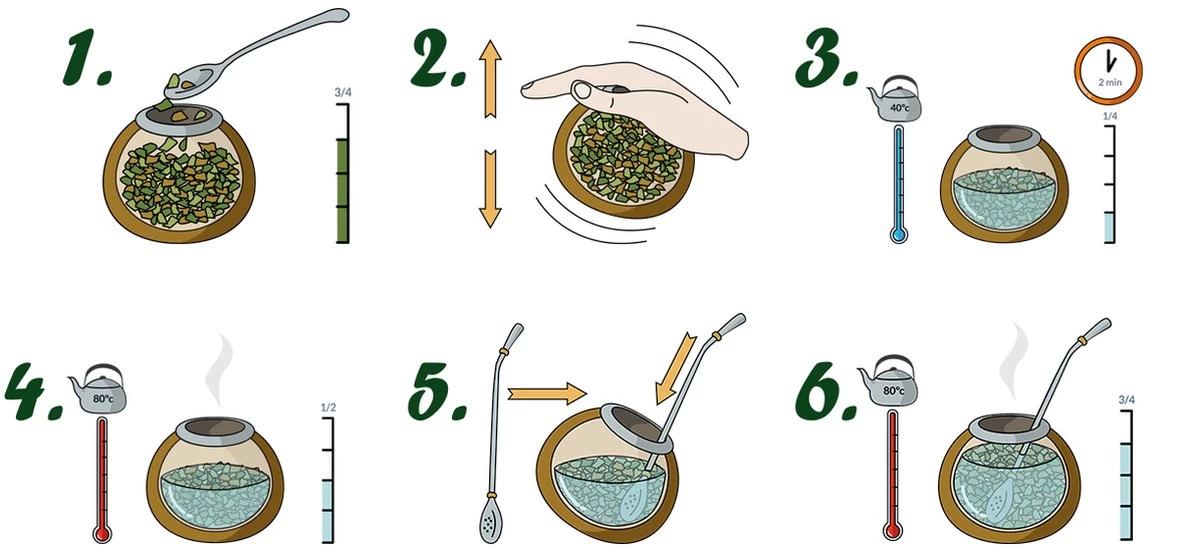 Oorspronkelijk drink je zoals in de afbeelding te zien en hieronder uitgelegd de mate uit een kalebas met een bombilla, maar geen paniek als je nog nooit van deze woorden gehoord hebt. Je kan de thee namelijk ook prima zetten met bijvoorbeeld een thee-ei of thee zeefje. Je doet dit alsvolgt: